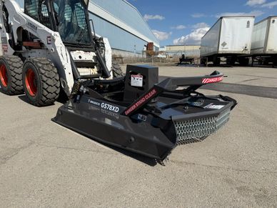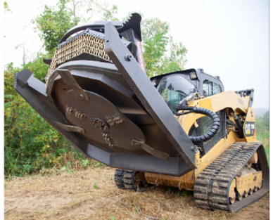 The Sidewinder Mini Skid Steer Brush Cutter features a high-speed dual-blade system and rugged design for cutting heavy brush on any job site.